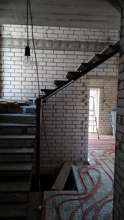 п.с. на самом нижнем фото (где лампочка висит) слева около лестницы большое вертикальное окно во всю высоту лестницы, а под лестницей будет вход в подвал (пока вместо него отверстие)