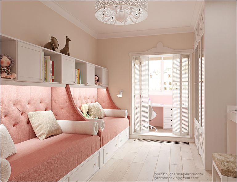 Интерьерное решение детской комнатыНадумала я переселять младшую в 2 года к старшей ( 5 лет). Старшая сейчас спит на кроватке икея, хочу два одинаковых диван-кровати поставить по стене. Понравились такого плана