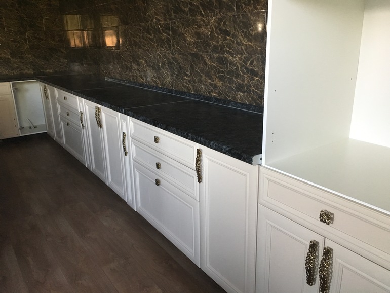 я за белую максимум беж. Не делайте акцентную кухню, не берите яркие цвета и буйство, у вас красивая плитка, красивый узор камня. пусть он будет украшением, надо его лишь подчеркнут
