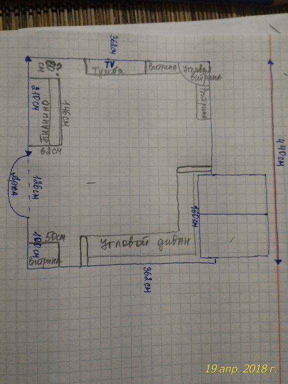 Необходимо разместить 1) пианино, размеры которого 146см х 62 см. Пока у меня стоит коричневое "Лирика", но т.к. дочка неплохо учится в музыкальной школе, планирую его этим летом заменить на белое и более серьезной фирмы. Также планируется поставить 2) угловой диван, окно при этом придется загораживать, но что делать? Раскладывать его буду только для гостей. 3) ТВ-зону угловую с витринами для книг и посуды.