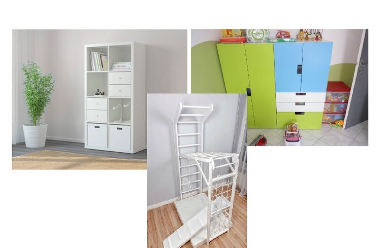 И кровать и диван и спорткомплекс на 12метрах это теснота и отсутствие пространства. Либо кровать, либо диван. Шкаф нужен большой, игрушки-книжки-вещи хранить не на полу же.