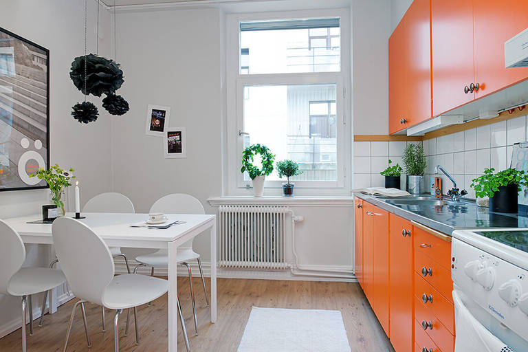 Купили мы квартиру, частично мебелирована, и кухонный гарнитур там оранжевого цвета, менять его в ближайшее время возможности нет. Но обои точно будем переклеивать . Ещё нужны стол и стулья, только вот какого цвета ?😔 а шторы какого цвета ?😔 ничего в голову не приходит уютного с таким цветом 😔 кухня 8,5 метров, южная сторона. Фото прилагаю