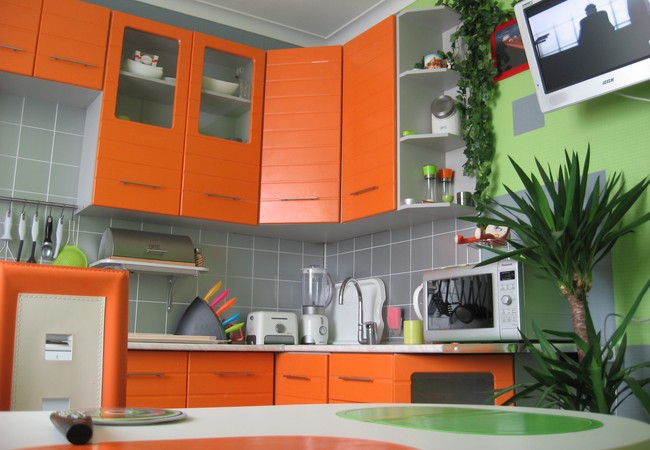 у меня оранжевая, тоже с ней купили. обои светло зеленого цвета однотонные. стол стекло и уголок кухонный бежевый. ноуголок я бы заменила сейчас на стулья или тот же уголок, но зеленого цвета