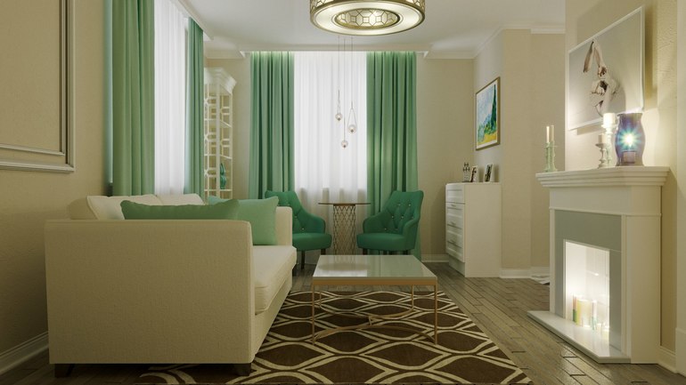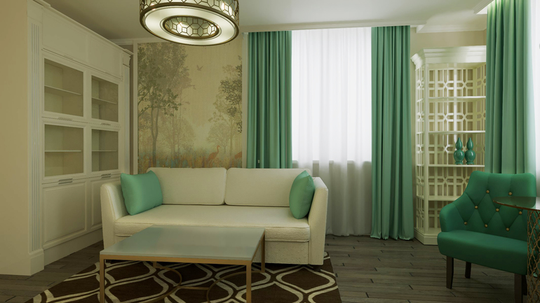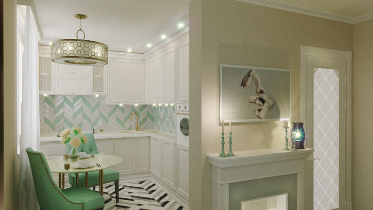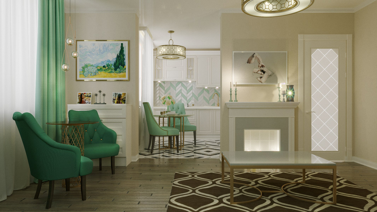 Двухкомнатная квартира в новом ЖК для молодой девушки, которая очень любит мятные и зеленоватые оттенки.