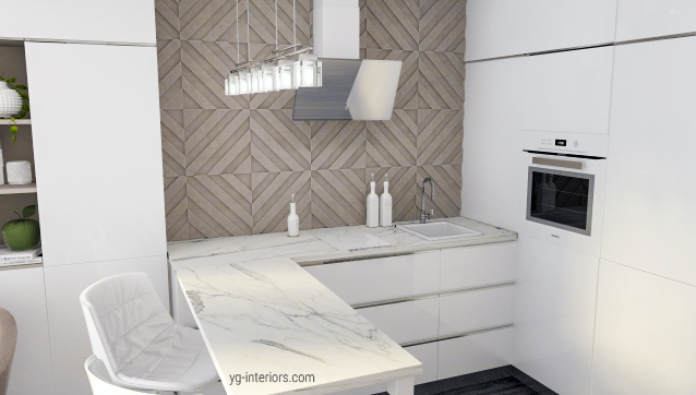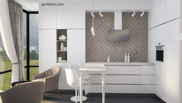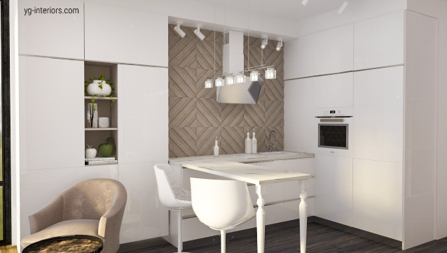Кухня вытянутой формы. Стояла задача сделать из нее уютное, стильное помещение.