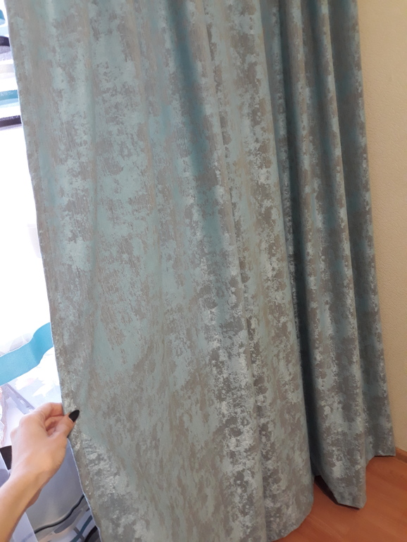Красивый тюль. Полоса на нем зеленая или голубая? Немножко спорят шторы и тюль. Мне кажется, они из разных стилей. Не хватает общего ракурса комнаты. Трудно представить, как кровать вписалась, какой цвет добавить. Есть обои похожие на ваши шторы по фактуре. Сложный бирюзовый цвет (лапатированные). Может одну стену ими, а три остальных теплый песочный оттенок подобрать, однотонные или очень светло серые.
