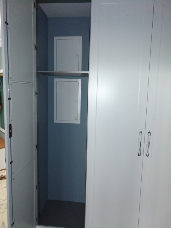 За левой дверцей щиток и слаботочка, место под пылесос, стремянку, что то ещё.