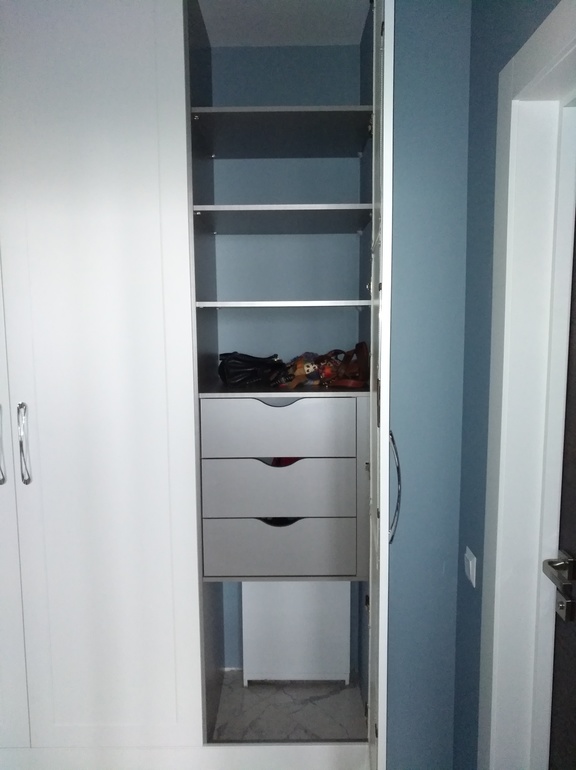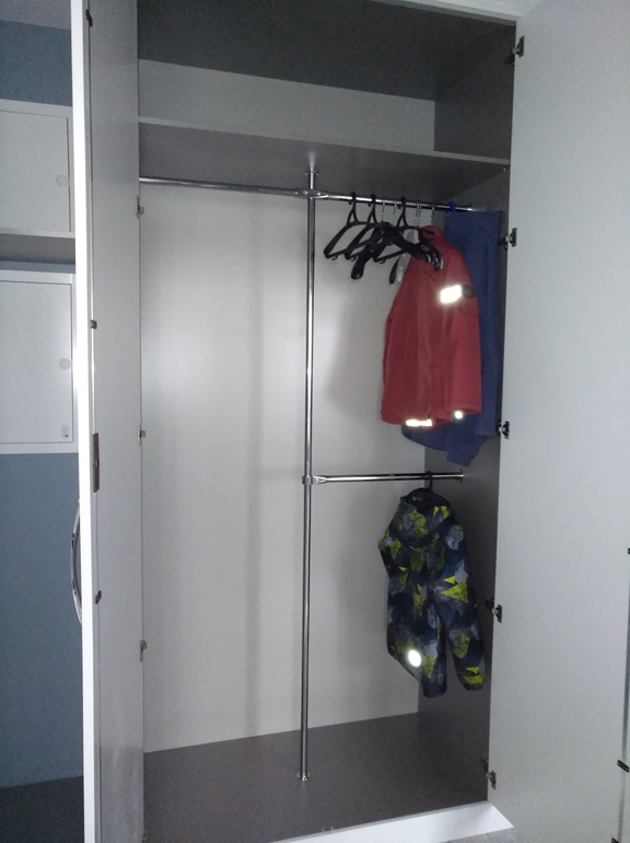 За правой дверцей внизу щиток отопления, можно при необходимости перекрыть его. Вниз обувь можно ставить, ящики для шапок, перчаток, ну и полки.