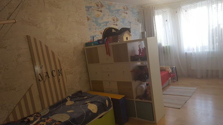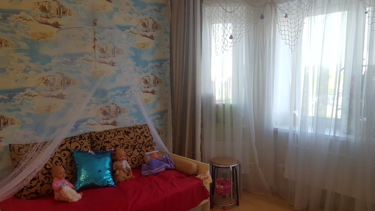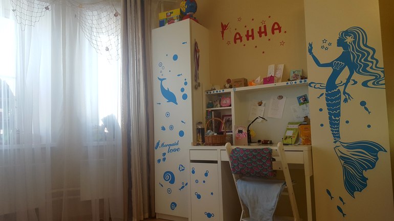 Сначала гости спрашивали где чья половина. Но когда повесили балдахин и наклейки на шкафы вопросы отпали. Сшить чехлы на подушки подходящие у меня все не доходят руки(