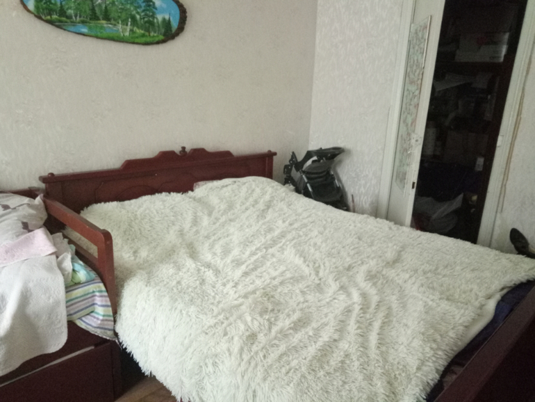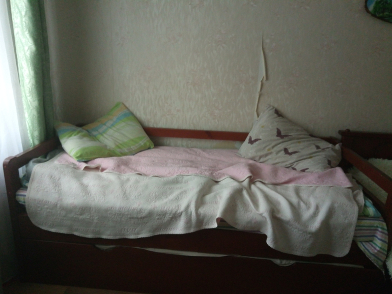 Все стены однотонные, а за кроватями с цветами белыми. Вот так сейчас, хочется сделать уютнее... Можно ли вместо двери в кладовку повесить рулонные шторы? Как бы вы раставили мебель в комнате (громко сказано мебель: две кровати и комод напротив детской кровати и места больше нет). Детская кровать выкатная (младшая спит внизу). Спасибо за ответы.