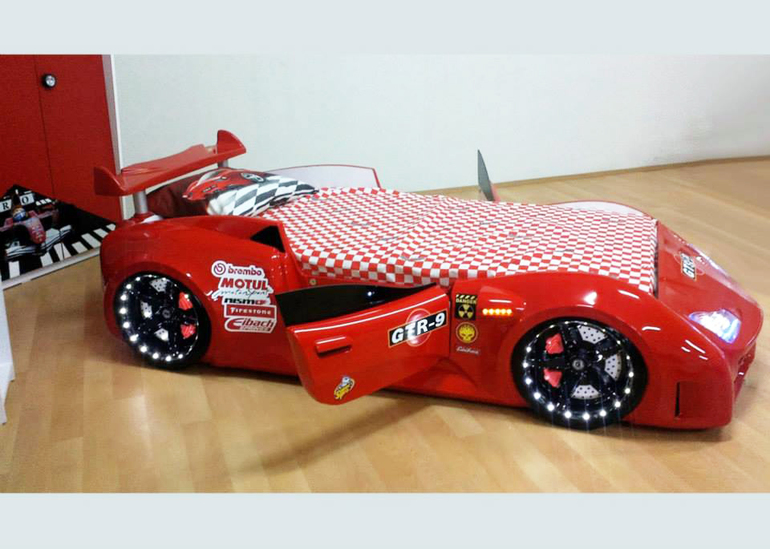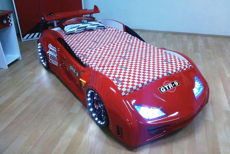 Не помню уже где, но видела детскую, там тоже кровать машина, на обоях только часть за машиной фотообои из мультика тачки. Остальная комната светлая.