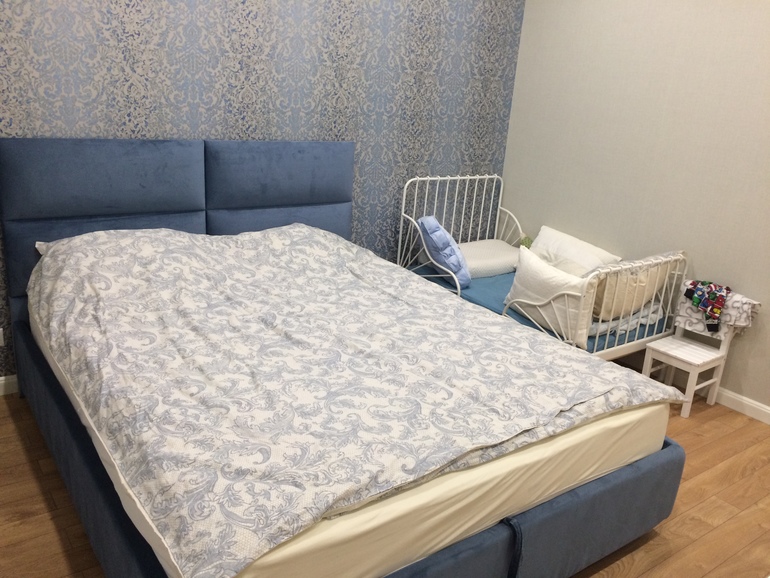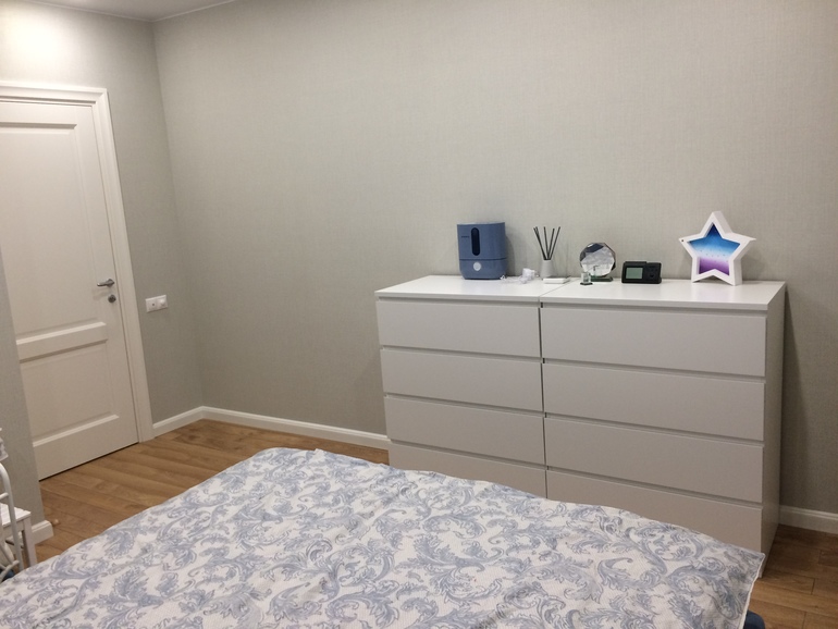 Пыталась сфотографировать спальню, но она такая маленькая (12 м2), что не знаешь куда встать)) в кадр ничего не помещается))