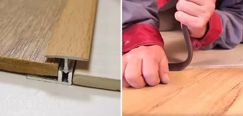 Под плитку монтируется тоненький порожек, после укладки ламината, одевается ответная часть.