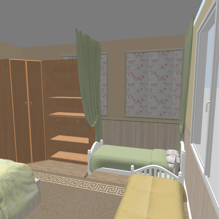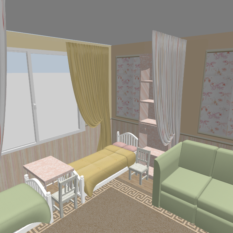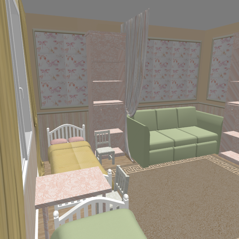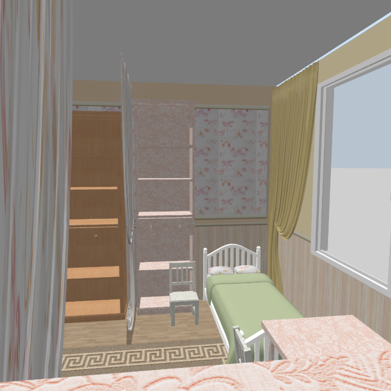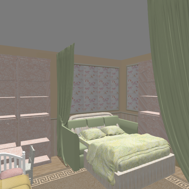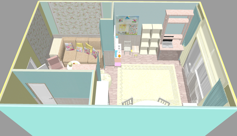 На стене все хочу вставки с обоями, так же как в большой комнате мы делали.. поэтому рисую их под разные планировки. Здесь "уехали" они, не поменяла в программе под эту планировку..