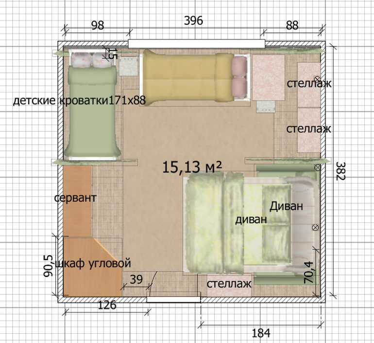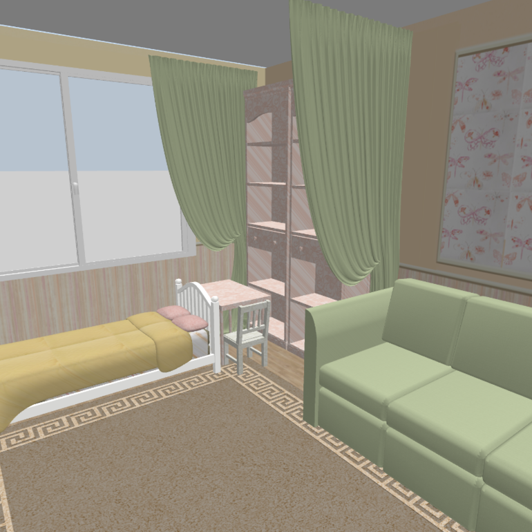 - взрослый диван-спальное место зеленого цвета; желательно зонирование..