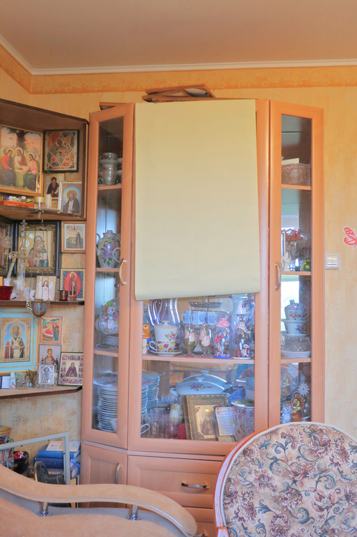 Думаю - закрыть стекла занавесочками.. Или опять-таки, зеркало вставить вместо передней стеклянной створки, закроется вся эта посудища.. Вот оно, это нечто.. обои там висят.. просто висят))
