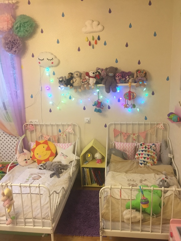 У нас вот так,две кроватки рядом,проход кончено остался узенький ,го девчонок это не смущает.Тоже долго думала,рассматривала и двухярусную,кровать-чердак И возможные варианты.Остановилась На двух кроватка рядышком и оказалась права-им действительно так веселее ,курлыкают друг с другом,немного могут побесится перед сном ,сказки читать удобнее и т.д:)