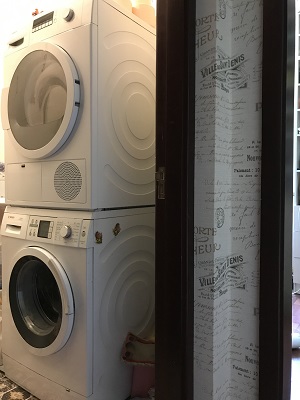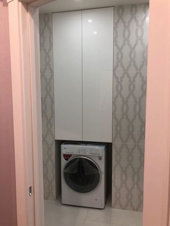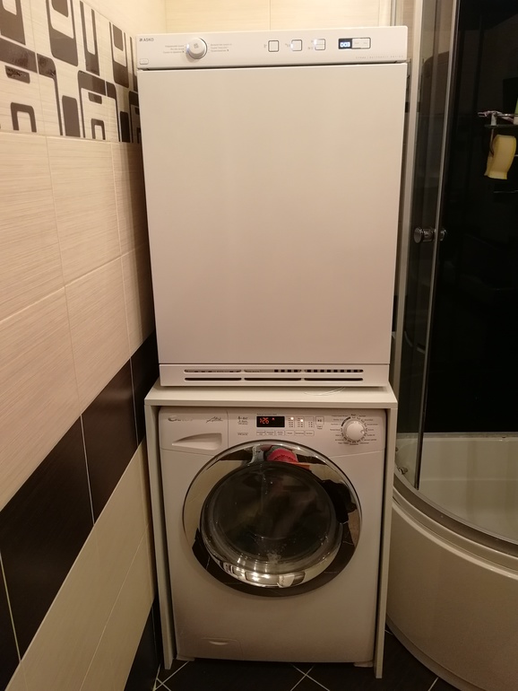 У меня санузел, где машинка, около 5 метров, и то я не стала ставить 2 машинки, колонна эта очень утяжеляет пространство. Я взяла 2в1. А сверху машинки сделала вместительный шкаф для бытовой химии и ящиков с бельем)