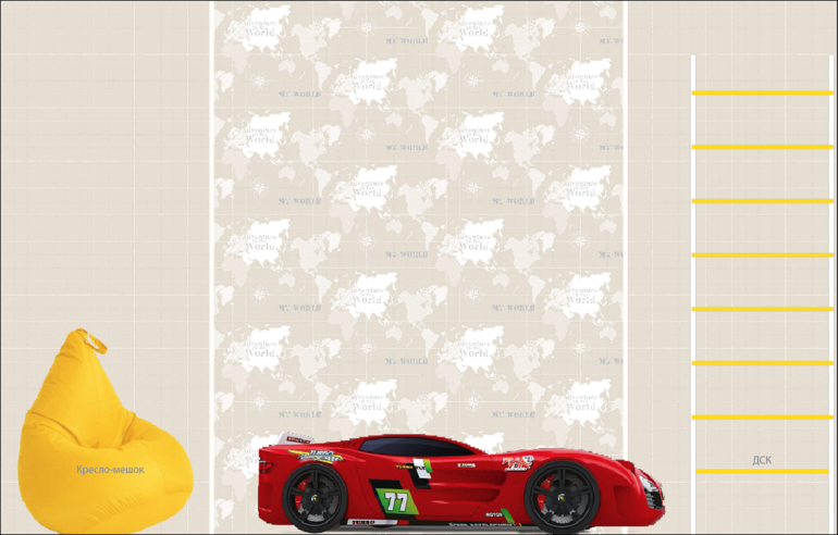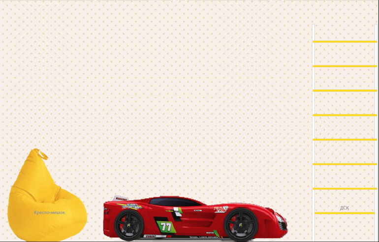 Из мебели у нас пока только кровать-машина красного цвета.