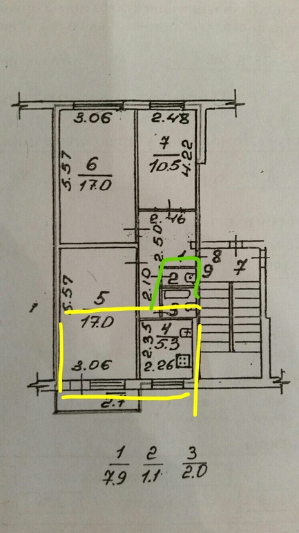 У нас аналогичная квартира. Правда,квадратура побольше. Ничего здесь особо не сделаешь. Кухню можно объединить, конечно, но тогда у вас это будет не кухня - гостиная, а кухня-туалет-коридор-гостиная, потому как убери вы эту стену между кухней и комнатой, взору откроются туалетные двери и каридор. Оно вам нужно? Хотя, у нас в доме так делают люди, но для меня это не комфортно. Туалет с ванной есть смысл соединить, эта стена много места занимает, хоть пространство появиться для машины, раковины и полок.