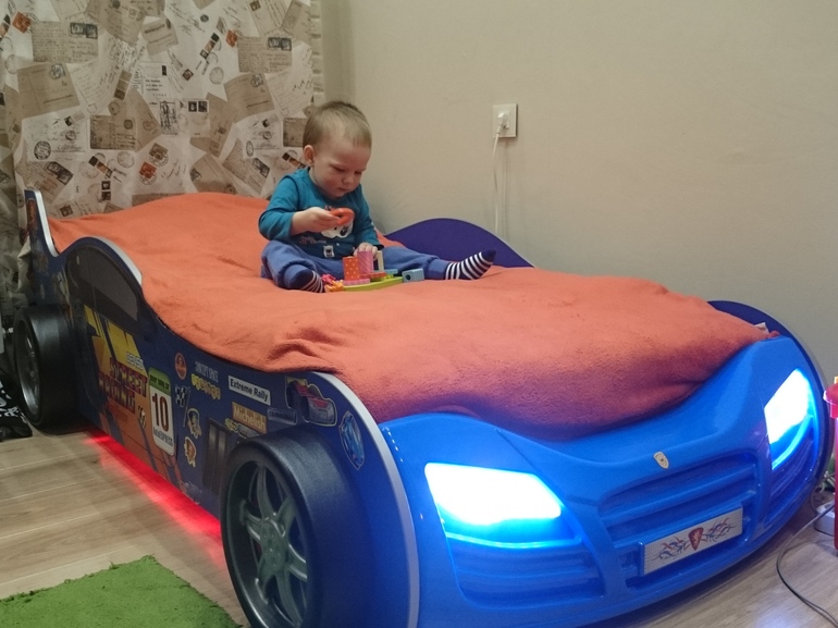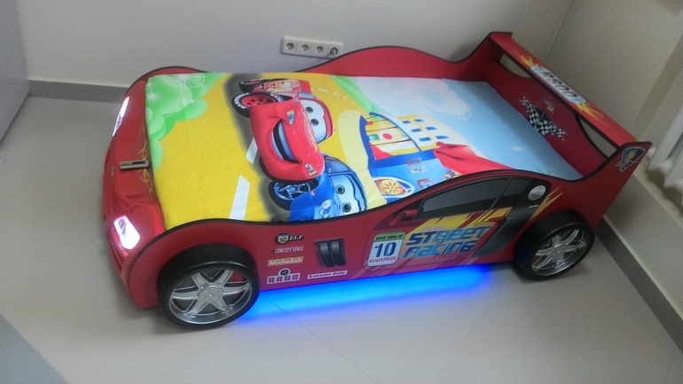 Нашему было 3.8 когда купили, ребенок доволен, фары горят у нашей, брали в Мебелев. А мне очень нравится, что она с подъемным механизмом и внутри юольшой ящик - удобно. Спальное место 180 см у нашей, надеюсь не слишком быстро вырастет из нее