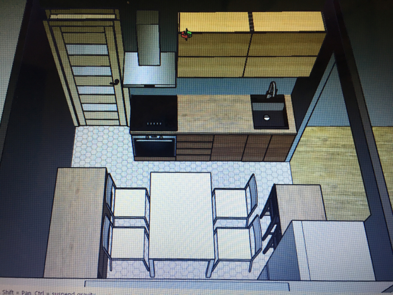 Вообще у вас в шаговой доступности кладовка, поэтому часть редко-используемой техники и посуды можно разместить там. Вообще до потолка предполагалась колонна с холодильником и техникой. Над раковиной нет шкафов, все по низу располагается, в том числе и сушка.