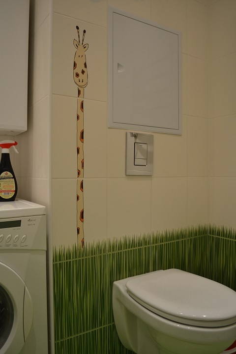 Юлия, мне кажется, Вам стоит посмотреть примеры санузлов в экостиле. Вот это точно будет ассоциироваться с природой, а не плитка с изображением травки-муравки, которая надоест потом ))