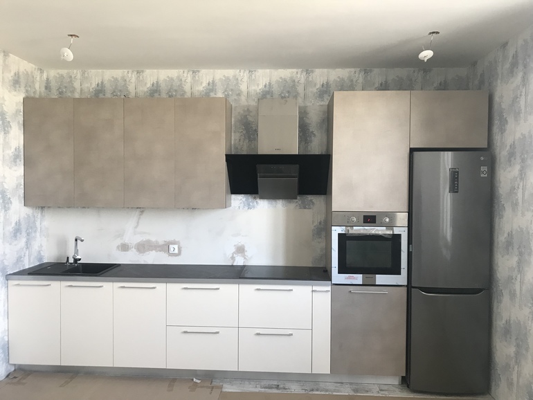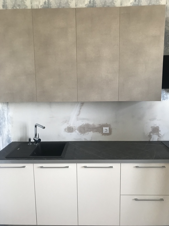Мне очень нравится Ваша кухня. На полу что-то тоже похожее на обои, да? Вы любите минимализм в цвете, и это верно. В интерьере рекомендуется присутствие не более 3-х цветов). Думаю, фартук должен быть в серых тонах.