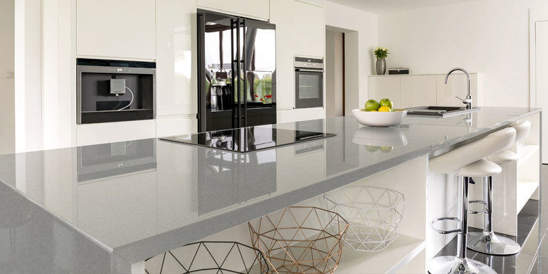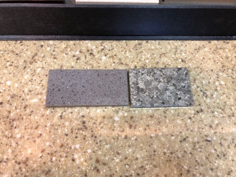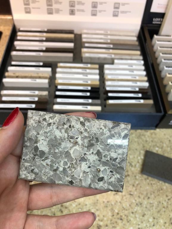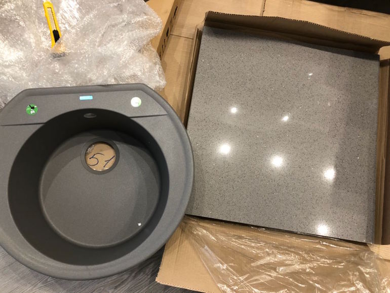 Изначально заказывали серый Технистон Старлайт Грей. Он красивый, с серебристыми редкими вкраплениями, но не такой светлый как представлялось. Вот фото этого кварца рядом с раковиной при хорошем освещении. Ну и цена, если делать из этого камня, то в 1 слэб не укладываемся, цена сразу выше. А если без бортиков, то укладываемся в 1 слэб. Фартук кухни все равно перекладывать будем, т.е. подвести к столешке не проблема.