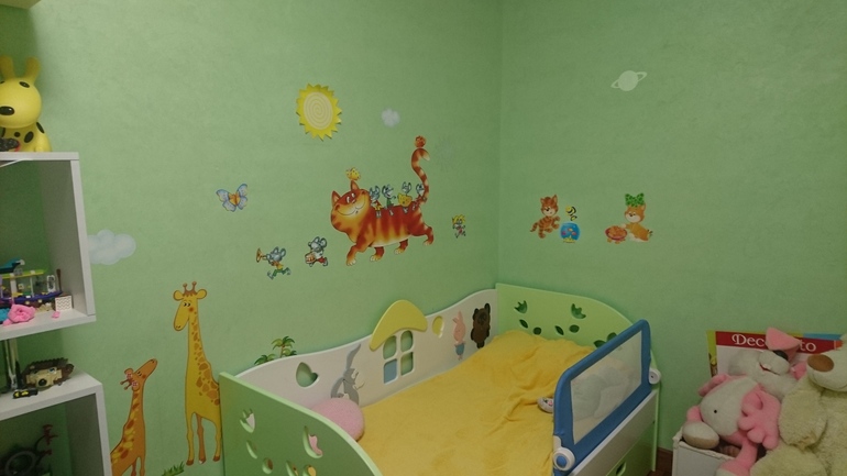 Пока я вижу выход только обои под покраску. Без узоров. И просто наклеить интерьерные наклейки (малышовые). Такой интерьер хоть менять потом проще)