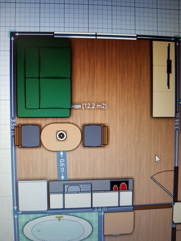 Согласна с Ольгой.) Только хотела написать, что тогда можно рядом с диваном еще что-то поставить). А у Вас выводы воды, случайно не там , где холодильник стоит? Расстояние 60 см между кухней и столом маловато, лучше 70 или 80 см. И можно взять угловой диван: