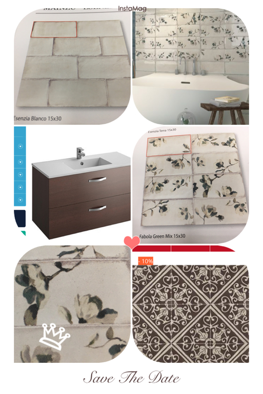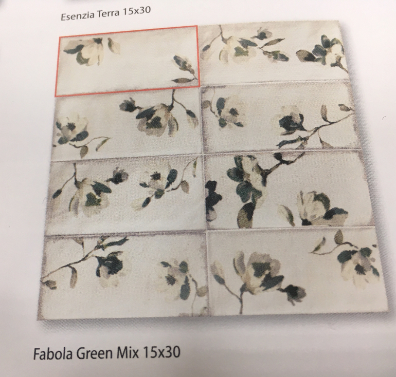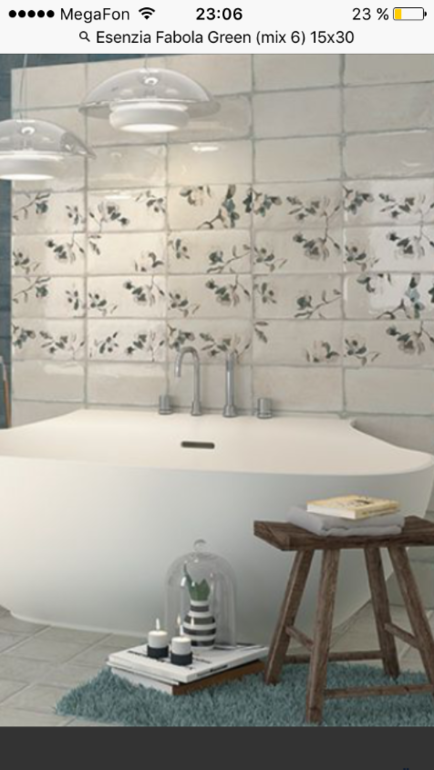 Интерьерное решение ванной комнатыИмеется плитка Mainzu Esenzia белая и Green mix, белая будет на 3 стены до середины стены, выше стены будут покрашены, с цветами на стену за ванной, мебель и плитка на пол с арнаментом( как на коллаже), не могу определиться как уложить белую плитку: кирпичная кладка или как и на стене за ванной одна под другой? И 4 ряда плитки с цветами будет достаточно? Нужен свежий взгляд со стороны, Ваше мнение?