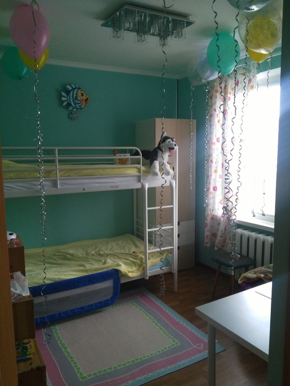 Кстати, смешно, но к вас с 2 детьми комната выглядит шире, чем с 1 :-)) Шкаф большой по левой стене стоит?