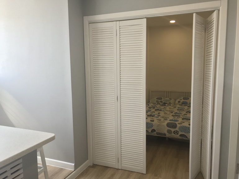 Мы хотели зонировать красивыми раздвижными дверями. Но такие двери, которые нам нравились, выходили около 300 тысяч. Дороговато))
