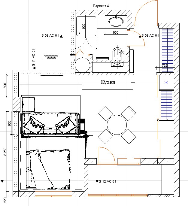 В данном случае плюсуюсь к раздвижной перегородке, только не до потолка, чтобы движению воздуха не препятствовать.