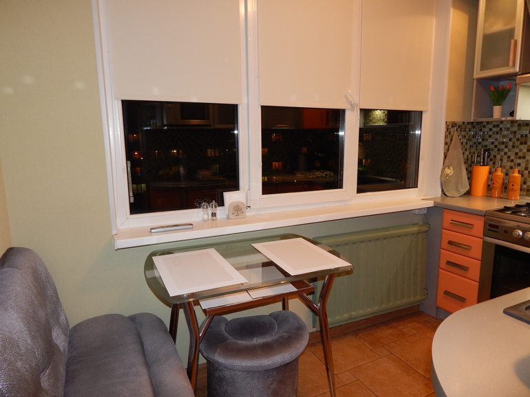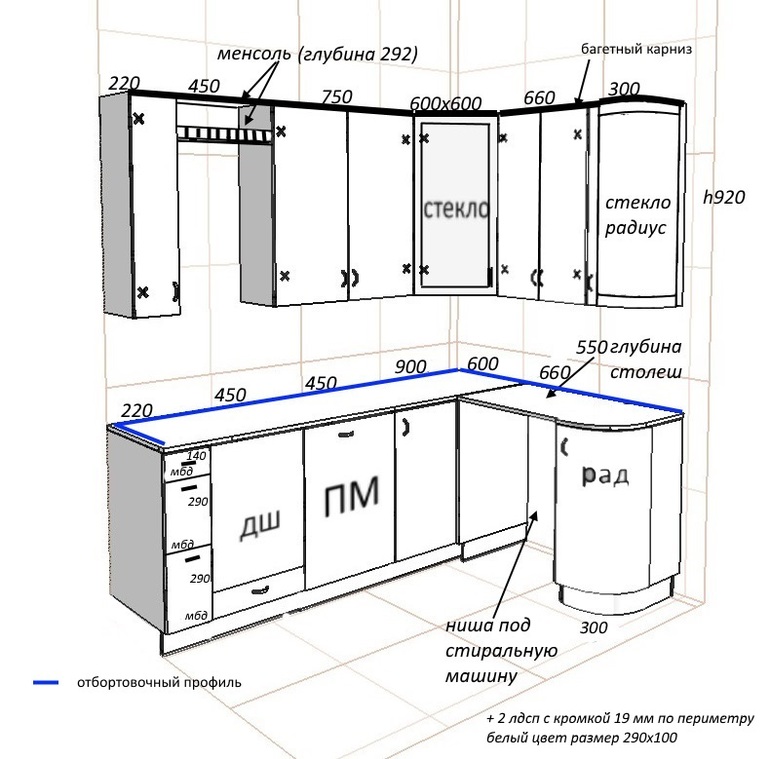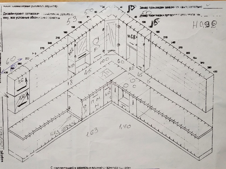 По стене, где 163 см - вход. По стене, где 140 см холодильник возле окна. Два маленьких шкафчика висят над кухонным столом (напротив холодильника)