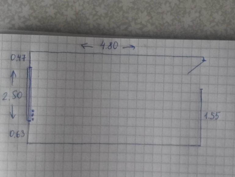 Под окном тремя точками обозначено расположение батареи. Дверь перенести нельзя, открывается тоже только вовнутрь, в коридор не получится.