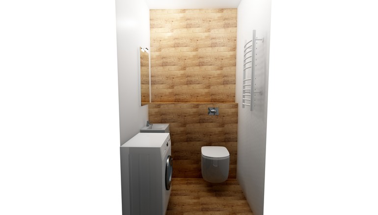 В живую это смотрится очень клево, у меня так сделан санузел, только деревянная плитка горизонтально лежит на стене напротив входа и полу, а боковые белые большие квадраты.