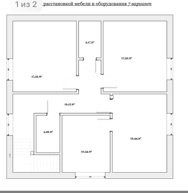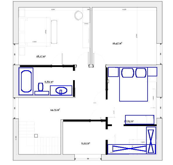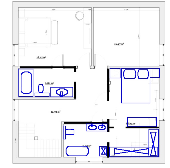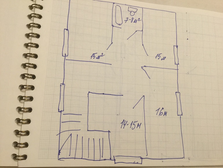 Муж начертил схему с 2 гардеробными (спальня не имеет совместной с с/у стены), но мне не нравятся совсем маленькие спальни (хотя изначально он говорил, что 10м2 мало).