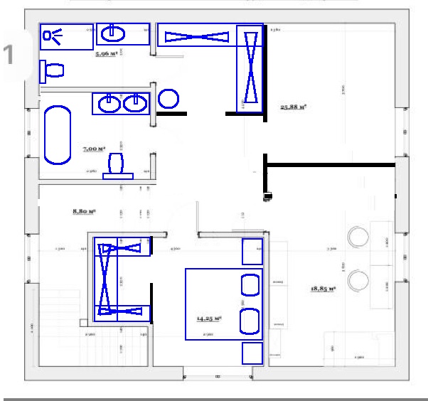 Вопросы и ответыСтояк у нас слева между окнами. Высота стен 1.5м (сверху и снизу на схеме), потом скос крыши. Прораб сказал, что с/у можно делать где угодно, не привязываясь к стояку, а на углах сделать ревизии (если вдруг засор). Нужно: 3 комнаты (1 родительская спальня, 1 спальня для двух детей и 1 игровая), с/у с окном (мой бзик), ванна на ножках (размер с/у наверное не менее 7м2), гардеробная. Не хочется коридоров. Я думала 2 детям сделать спальню 15-20м2, игровую 10м2, нам спальню 15м2 минимум.