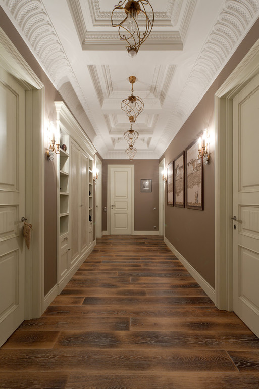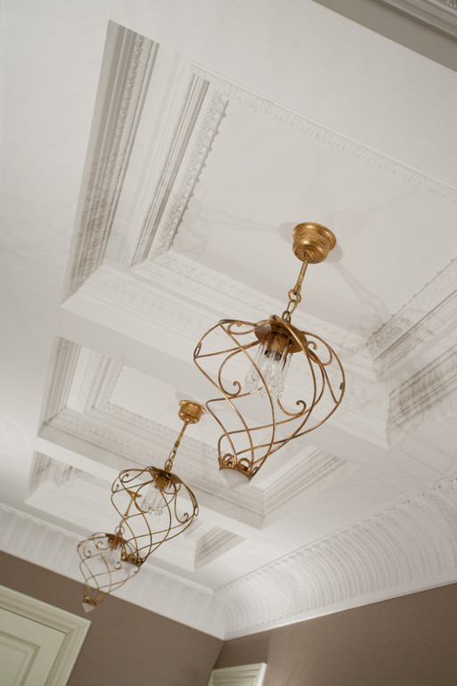 Гипсокартон+ полиуретановые молдинги+ белая краска. Стоимость - такая же как обычный гкл потолок. Удорожание только за молдинги, они недорогие, клеятся на клей Монтаж (ПВА). За работу по наклейке их тоже недорого, за площадь коридора 20 кв.м я платила в районе 5-7 тысяч