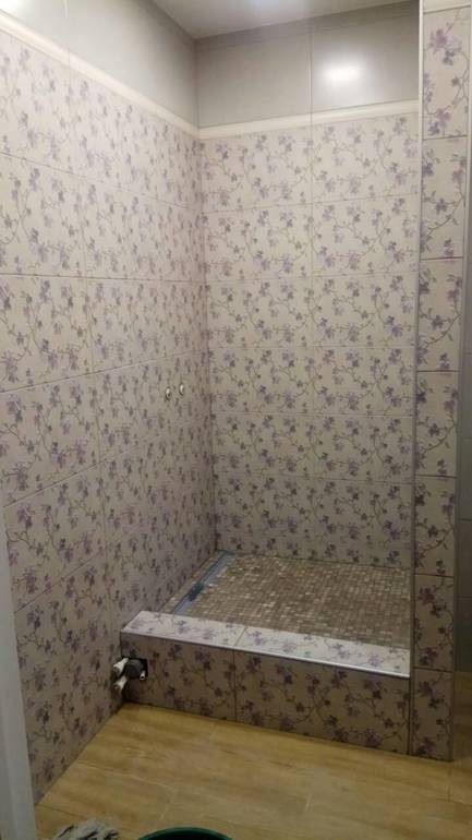 У нас металлические уголки. Конечно, перед началом ремонта я много читала и была в курсе про запил под 45 градусов. Но, если честно, мне было страшно. У нас душевая кабина в строительном исполнении, и если ребенок поскользнется и упадет на этот запил, то может все печально закончиться. Извините за ремонтные фотки, но на них лучше всего виден уголок. Мне кажется, очень аккуратно все выглядит.