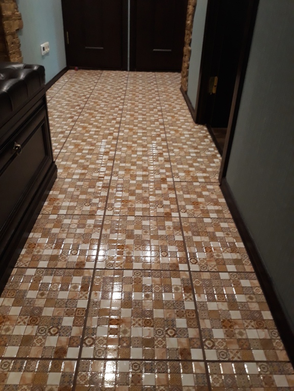 Привет. Плитка с тёплым полом, отличный выбор! Мы остановились на мозаичном орнаменте. Чем ярче - тем меньше видно всякую пыль. Ведь не всегда есть время натирать полы... Раньше был чёрны керамогранит - очень маркий. Светлый - тоже видно каждую капельку. А мозаика - то , что нужно.
