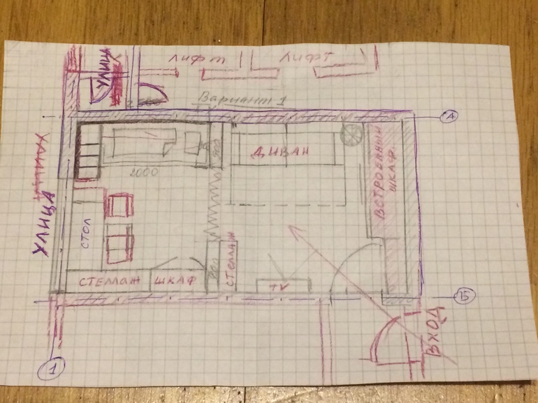 И тут нужно впихнуть невпихиваемое. Комната большая, было принято решение разделить на 2 зоны (гостиная и детская). Все бы хорошо, но.... у квартиры, а точнее у комнаты есть большой минус, а точнее 2 холодные стены, одна улица, а вторая-лифтовой холл и выход на лестницу Н1 ( проход через балкон), и зимой угол по оси А1 очень холодный (и примерно 1,2 м по оси А стена холодная).