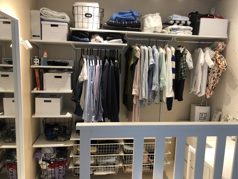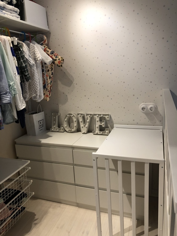 Для малыша необходимо добавить 2 комода для вещей и пеленальную зону в уже существующий шкаф. Для этого пришлось шкаф немного пересобрать, чтоб освободить правый нижний угол. Впихнула!