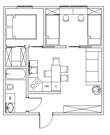 Получались отдельные спальные места для родителей и детей и кухня-гостиная. Это если стены не несущие. При этом мокрая зона приходилась на зону коридора, т.е. согласовать можно. А у Вас ещё и балкон есть, если с детской соединить, она станет побольше, или поменять ее местами со спальней.