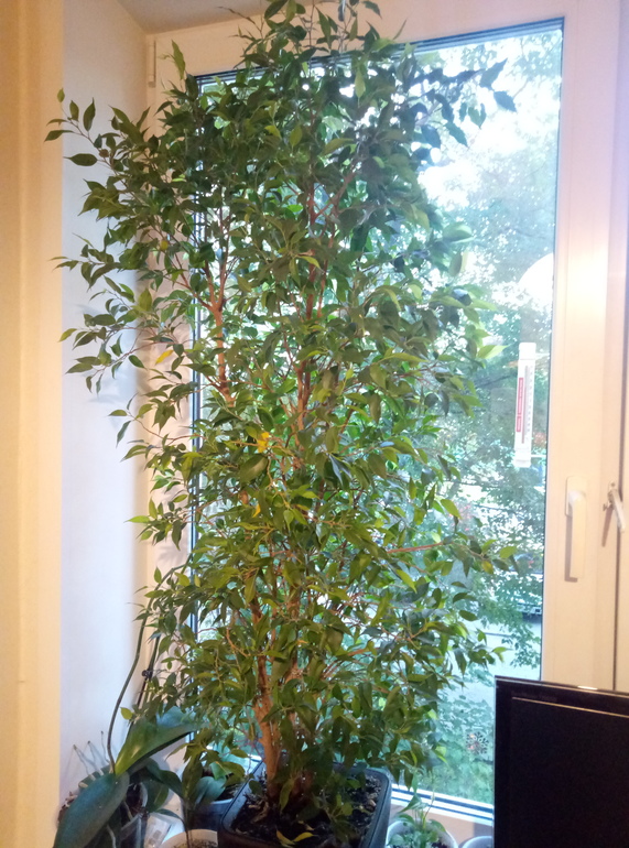 В другой комнате подоконник уставлен фиалками. Туда не переселишь. На кухне фикус в большом горшке, орхидеи.