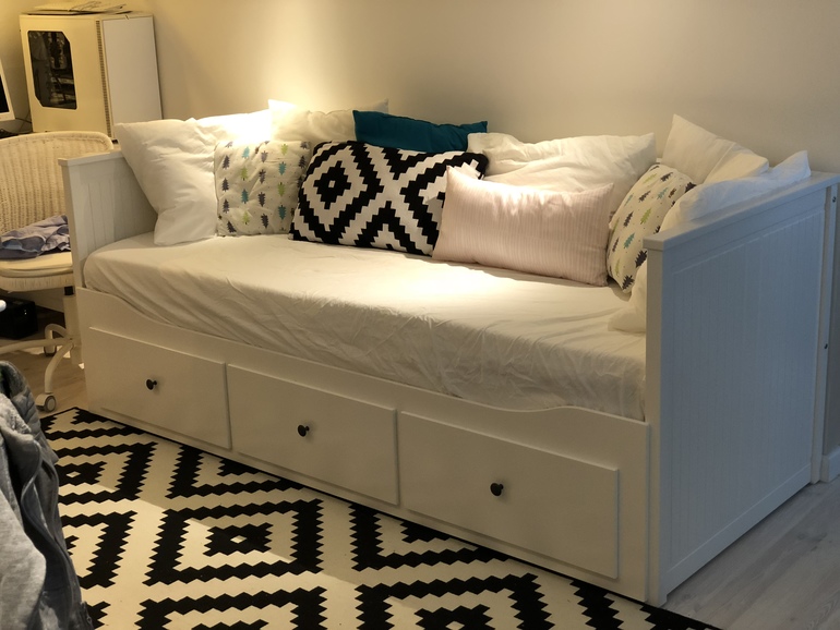 а мы купили немного другую: бримнес. Принцип такой же, но внешне она компактнее выглядит. У дочери комната маленкая 11м, я подумала, что слишком громоздко будет хэмнес смотреться. Для девочки подростка взяли. Еще не собрали.Над матрасами тоже думаю.. Пока куплю один икеевский, а там позже, как девушка ниже писала, латексно/кокосовый возьму.
