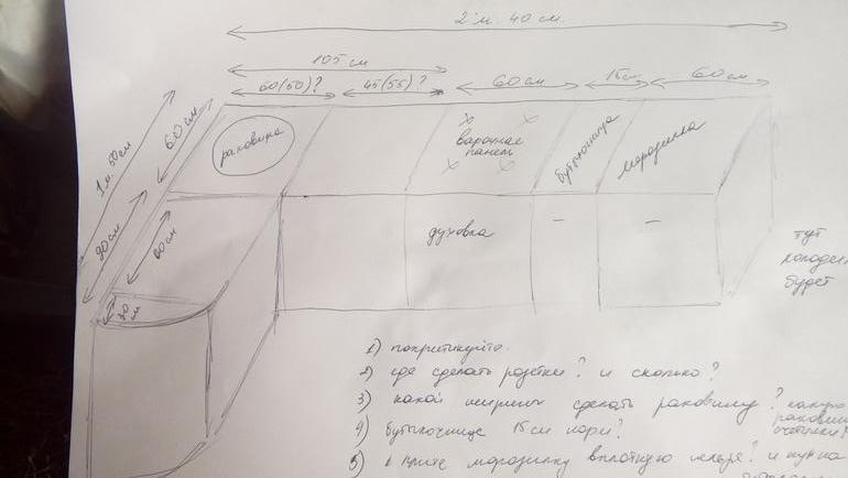 6. И еще вопрос, глубина столешницы по стене, которая 1м 50см, тоже должна быть 60см или можно сделать ее поуже 40-45см, например?