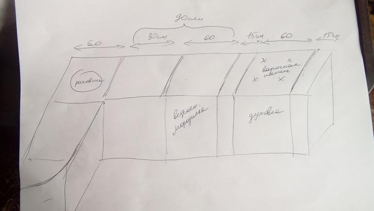 5. По другой стене хочу закругленный шкаф на 30 см( или лучше побольше?) и 60 см. В эти 60 см нужно впихнуть какую- то технику? Или оставить под кастрюли?
